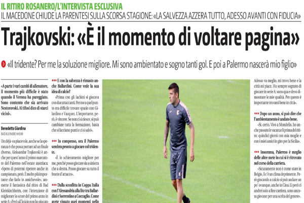 Intervistato dalle colonne de “Il Giornale di Sicilia” Alex Trajkovski si è espresso in merito alla nuovastagione che si appresta ad iniziare: «3-4-3? È lo schieramento migliore per me, perché posso giocare sia a sinistra che a destra. Posso giocare su tutto il fronte d’attacco. Tanti balcanici in squadra? E’ vero. Quando sono arrivato c’eranoAndelkovic, Jajalo e Struna. Dopo di me è arrivato Posavec. Siamoc omunque una squadra, siamo uniti anche con gli italiani e con gli altri. Ci aiutiamo a vicenda sul campo e fuori. Insieme vogliamo voltare pagina, dobbiamo lottare per la squadra e dare tutto per salvarci prima dell’ultima giornata. Se poi si può fare di più, lo vedremo. Prima però dobbiamo pensare alla salvezza. L’importante è che all’ultima giornata non ci sia un’altra partita da dentro o fuori come col Verona. Per noi è stato davvero difficile scendere in campo pensando agli scontri delle avversarie dirette. Poi quando il Verona ha segnato il gol del pareggio…mamma mia».
