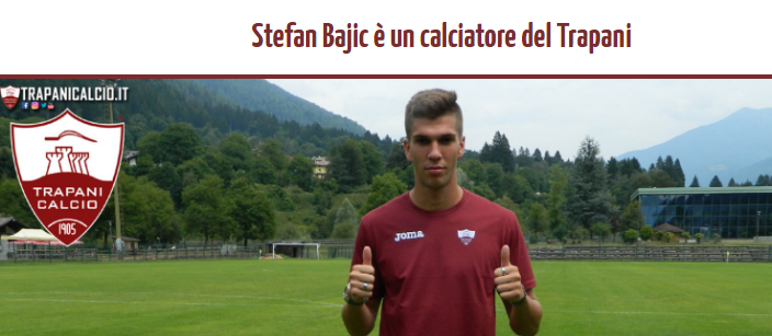 “La Società Trapani Calcio comunica di avere perfezionato l’ingaggio di Stefan Bajic, difensore, proveniente dalla Cremonese. Bajic arriva al Trapani con la formula del prestito temporaneo con diritto di opzione e contro opzione ed ha già raggiunto la sede del ritiro pre – campionato a Spiazzo.