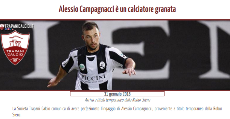 Il Trapani calcio annuncia tramite il proprio sito ufficiale di aver ingaggiato in prestito dalla Robur Siena l’attaccante Alessio Campagnacci. Di seguito il comunicato del club:
