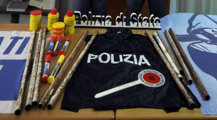 “I supporter sono stati fermati da personale del Commissariato di P.S. di Cefalù, domenica sera nei pressi nel casello Autostradale di Buonfornello, mentre facevano rientro dal Comune di Enna, dove avevano assistito alla partita valevole per il campionato di serie “D” disputata tra la squadra del Marsala e la compagine del Troina. La Questura di Palermo, allo scopo di prevenire eventuali disordini legati a possibili incroci di tifoserie locali, impegnate la domenica in trasferimenti autostradali al seguito delle rispettive compagini calcistiche, ha approntato specifici servizi di controllo, osservazione e “puntellamento” lungo le principali arterie autostradali della provincia palermitana. Tale dispositivo, domenica scorsa, ha efficacemente represso sul nascere l’inappropriata, censurabile e pericolosa condotta di un gruppo di ultras marsalesi, organizzatisi all’interno di una carovana di automobili, in sosta sulla corsia di emergenza, all’altezza della chilometrica 40 in direzione dell’A19 Catania – Palermo. Ad attirare gli agenti erano stati alcuni bagliori provenienti da quella fila di autovetture che, ad un esame più attento, sono risultati essere fumogeni accesi incautamente dagli occupanti delle medesime autovetture, creando una situazione di serio pericolo per gli automobilisti che transitavano. Il gruppo di tifosi è stato, pertanto, sottoposto a controlli e perquisizioni personali che si sono estese anche alle autovetture. Nel corso di tali attività gli agenti hanno rinvenuto ben 10 tubi in metallo di diverse dimensioni, fumogeni, fuochi pirici custoditi all’interno di uno zainetto ed alcuni striscioni di sostegno alla squadra, uno dei quali riportante la figura di un ultrà che indossa una felpa con cappuccio e tiene con la mano dietro la nuca una spranga. Si è proceduto, pertanto al sequestro del materiale rinvenuto ed alla denuncia dei 17 “ultras”, tra i quali anche un minorenne, molti dei quali con precedenti di Polizia. A carico dei predetti sono state avviate anche le procedure amministrative finalizzate all’emissione di provvedimenti di Daspo. Palermo, 25 Ottobre 2019″.