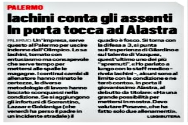 “Un’impresa, serve questo al Palermo per uscire indenne dall’Olimpico. Lo sa Iachini, tornato con entusiasmo ma consapevole che serve tempo per mettersi alle spalle le magagne. I continui cambi di allenatore hanno minato le certezze, le diverse metodologie di lavoro hanno lasciato sconquassi nella condizione. Se si aggiungono gli infortuni di Sorrentino, Lazaar e Goldaniga il quadro è fosco. Si torna con la difesa a 3, si punta sull’esperienza di Gilardino e sul talento di Vazquez, quest’ultimo uno dei più ‘spremuti’. In porta il giovanissimo Alastra, al debutto da titolare”. Questo quanto si legge sull’edizione odierna di “Tuttosport”.