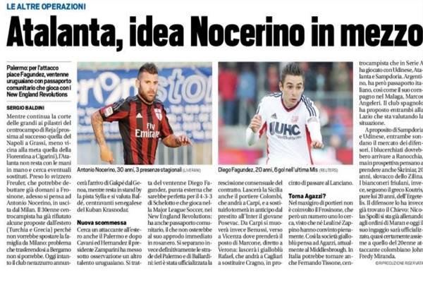 Tuttosport: “Atalanta può chiudere per Nocerino, Palermo su Fagundez – il punto sul mercato”