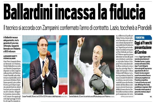 “Davide Ballardini si accorda con Zamparini per disputare un’altra stagione sulla panchina del Palermo. […] Ieri è stato il giorno del via libera a Ballardini: Zamparini, dopo un confronto con il nuovo direttore sportivo Rino Foschi ha deciso di continuare con l’allenatore della salvezza. Ballardini non avrà il contratto in scadenza nel giugno prossimo adeguato, ma patron e ds hanno garantito al tecnico il potenziamento di una squadra che nell’ultima stagione ha mantenuto la categoria con eccessiva sofferenza […]”. Questo quanto riporta “Tuttosport”.