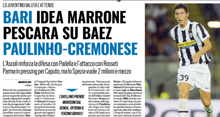 “Il Bari che ha conquistato il quarto turno di Coppa Italia pensa in grande anche per quanto riguarda il campionato di serie B che vuole vivere da protagonista. E allora ecco che il prossimo “regalo” per il tecnico Grosso potrebbe essere il centrocampista juventino Marrone. L’esperto torinese sta valutando la proposta e se non dovessero arrivare a stretto giro di posta opportunità dalla massima divisione potrebbe scegliere la sfida pugliese. Dal Bari, che potrebbe cedere in prestito al Trapani il portiere Furlan, all’Ascoli, che ha praticamente chiuso per il difensore Padella del Benevento (per lui un triennale) e l’attaccante Rosseti (cinque anni al bomber di proprietà Juventus che l’anno scorso ha giocato nel Lugano). A proposito di attaccanti, pressing totale del Parma per Caputo che vuole lasciare lo Spezia ma i liguri vogliono almeno 2.5 milioni di euro e quindi la chiusura dell’affare non pare così imminente. Rimanendo sul fronte attaccanti, da segnalare il colpo della Cremonese: salvo controindicazioni dell’ultimo istante il tecnico Tesser potrà contare sull’esperienza di Paulinho che dopo aver fatto bene al Livorno è finito al Al Arabi ma è pronto per lasciare il Qatar e tornare in Italia. Grandi mosse per l’Avellino, capace di assicurarsi il centrocampista offensivo genoano Morosini prima di aver prenotato il suo compagno rossoblù Brivio. Gli irpini al lavoro anche per il difensore Marchizza del Sassuolo anche se resta vigile su Blanchard del Carpi che piace anche ai rumeni del Cluj. Il difensore croato Milic non ha convinto il Carpi dopo la prova sostenuta e non dovrebbe quindi ottenere il tesseramento dal club emiliano. L’Empoli insiste con il Torino per ottenere il prestito dello svedese Gustafson sul quale resta forte l’interesse dell’Ascoli. In chiusura la Salernitana, pronta ad ufficializzare gli acquisti di Radunovic, Asmah e Gatto”. Questo quanto riportato da “Tuttosport”.