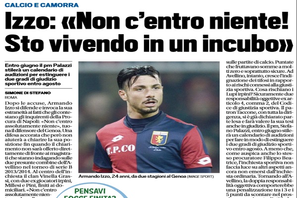 Tuttosport: “Calcio e camorra, Izzo: «Non c’entro niente! Sto vivendo in un incubo»”