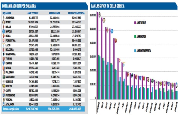 “Ben sette squadre del nostro campionato raccolgono il 61,75 per cento di tutti gli ascolti tv. Il 61 per cento dei tifosi si sintonizza su Sky e la gara più seguita davanti allo schermo è stata InterJuventus con un AMR (average minute rating: ascolto medio e share) di 3.353.620 spettatori. La 27ª giornata è stata la più seguita in tv con Juventus-Inter gara top. Sono 63 le gare di Serie A che hanno avuto meno spettatori in tv di quanto ne abbiano avute dal vivo (di media) in Bundesliga. Empoli-Chievo è stata la gara meno seguita in tv: 3.705 spettatori”. Questo quanto riportato da “Tuttosport”.