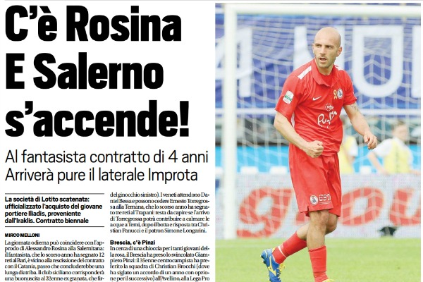 “La giornata odierna può coincidere con l’approdo di Alessandro Rosina alla Salernitana: il fantasista, che lo scorso anno ha segnato 12 reti al Bari, è vicino alla rescissione del contratto con il Catania, passo che concluderebbe una lunga diatriba. Il club siciliano corrisponderà una buonuscita al 32enne ex granata, che firmerà con la Salernitana un accordo quadriennale da oltre un milione di euro complessivo. Nel frattempo i campani sono vicini a chiudere per il 23enne Riccardo Improta, laterale ex Bologna e Cesena (dove ha giocato soltanto due gare a causa di un grave infortunio al ginocchio sinistro) ma di proprietà del Genoa. La Salernitana, poi, ha ufficializzato l’arrivo del portiere greco Michalis Iliadis: il 20enne ex Iraklis ha firmato un biennale. Il Carpi saluta Mbakogu Il Carpi ha ceduto Jerry Mbakogu ai russi del Krylya Sovetov: l’operazione – prestito con obbligo di riscatto – porterà agli emiliani due milioni di euro (600.000 immediati per il prestito). Il Carpi, che ha già preso Comi e Catellani, cerca un’altra punta e attende gli sviluppi della discussione tra Pietro Iemmello e lo Spezia: il 24enne, reduce dai 29 gol in Lega Pro con il Foggia, è tornato in Liguria ma non ha trovato l’accordo per il rinnovo, per questo è possibile la cessione (ma su Iemmello c’è soprattutto il Sassuolo). Matteo Ardemagni è la priorità del Benevento, che cerca un centravanti e offre un triennale all’ex Perugia, l’alternativa è Guido Marilungo, cercato anche dall’Ascoli che ieri ha presentato Francesco Cassata. Il centrocampista reduce dal secondo posto agli Europei Under 19 arriva ad Ascoli in prestito (con diritto di opzione e contro-opzione) dalla Juventus. L’Ascoli ha preso anche il terzino Filippo Florio, girato subito alla Lucchese. Il Verona, che aspetta il brasiliano Bessa dall’Inter, ha ingaggiato Antonio Caracciolo con un triennale: l’ex Brescia rafforza una difesa che perde per un mese Michelangelo Albertazzi (stiramento al legamento collaterale del ginocchio sinistro). I veneti attendono Daniel Bessa e possono cedere Ernesto Torregrossa alla Ternana, che lo scorso anno ha segnato tre reti al Trapani: resta da capire se l’arrivo di Torregrossa potrà contribuire a calmare le acque a Terni, dopo il botta e risposta tra Christian Panucci e il patron Simone Longarini. Brescia, c’è Pinzi In cerca di una chioccia per i tanti giovani della rosa, il Brescia ha preso lo svincolato Giampiero Pinzi: il 35enne centrocampista ha preferito la squadra di Christian Brocchi (dove ha siglato un accordo di un anno con opzione per il successivo) all’Avellino, alla Lega Pro del Livorno e ad una destinazione nel campionato indiano. Doppio colpo per il Perugia, che a centrocampo aggiunge la qualità di Jacopo Dezi – 24enne in prestito dal Napoli – mentre in difesa arriva Gianluca Di Chiara, terzino sinistro protagonista nel Foggia che ha sfiorato la promozione in B: il 22enne arriva dal Catanzaro in prestito con diritto di riscatto. La Pro Vercelli cerca un acquirente per Dominique Malonga, fuori dai piani di Moreno Longo, soprattutto dopo l’arrivo di Giulio Ebagua. Il Bari ha chiesto al Sassuolo Diego Falcinelli, che però valuta soltanto destinazioni in A, mentre per il centrocampo entra in gioco Richard Lasik, 24enne slovacco ex Brescia, sul quale però si è mosso con anticipo l’Avellino. Spal su Vicari A Pisa, dove Maurizio Mian ha lasciato la carica di presidente onorario (dopo soltanto una settimana), quella odierna può essere una giornatachiave per la possibile cessione del club: i rappresentanti del fondo di investimento di Dubai (guidato da Pablo Dana) puntano ad incontrare la proprietà nerazzurra. Il tempo stringe, dato che il fondo di Dubai – supportato dalla tifoseria – vuole trovare un accordo per riportare subito in panchina Rino Gattuso. La Spal vuole completare la difesa con Francesco Vicari, pronto a lasciare il Novara con un anno d’anticipo sulla scadenza del contratto: l’arrivo di Gennaro Scognamiglio ha chiuso ogni spazio al 22enne, e gli emiliani propongono a Vicari un triennale. La ricerca di un difensore porta il Vicenza su Nicolò Cherubin, in esubero al Bologna, in pole rispetto a Emanuele Terranova e Dario Zuparic”. Questo quanto riportato da “Tuttosport”.