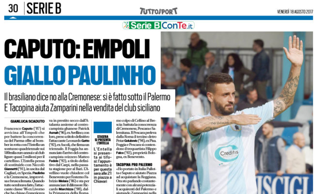Tuttosport: “Caputo: Empoli. Giallo Paulinho. Il brasiliano dice no alla Cremonese: si è fatto sotto il Palermo. E Tacopina… Tutte le trattative del giorno in serie B”