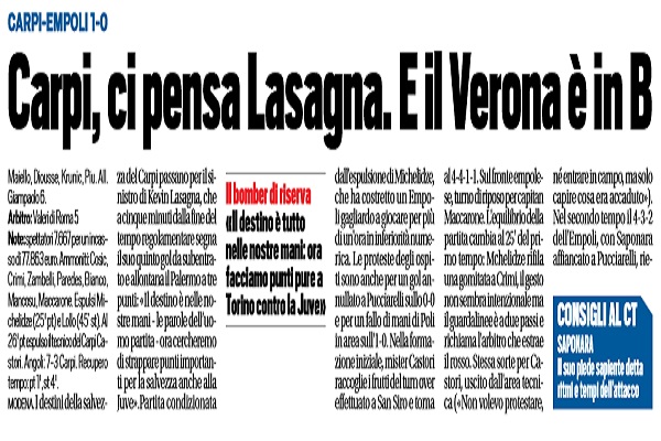 “I destini della salvezza del Carpi passano per il sinistro di Kevin Lasagna, che a cinque minuti dalla fine del tempo regolamentare segna il suo quinto gol da subentrato e allontana il Palermo a tre punti: «Il destino è nelle nostre mani – le parole dell’uomo partita – ora cercheremo di strappare punti importanti per la salvezza anche alla Juve». Partita condizionata dall’espulsione di Michelidze, che ha costretto un Empoli gagliardo a giocare per più di un’ora in inferiorità numerica. Le proteste degli ospiti sono anche per un gol annullato a Pucciarelli sullo 0-0 e per un fallo di mani di Poli in area sull’1-0. Nella formazione iniziale, mister Castori raccoglie i frutti del turn over effettuato a San Siro e torna al 4-4-1-1. Sul fronte empolese, turno di riposo per capitan Maccarone. L’equilibrio della partita cambia al 25′ del primo tempo: Mchelidze rifila una gomitata a Crimi, il gesto non sembra intenzionale ma il guardalinee è a due passi e richiama l’arbitro che estrae il rosso. Stessa sorte per Castori, uscito dall’area tecnica («Non volevo protestare, né entrare in campo, ma solo capire cosa era accaduto»). Nel secondo tempo il 4-3-2 dell’Empoli, con Saponara affiancato a Pucciarelli, riesce a creare più di un pericolo al Carpi, che con l’ingresso di Lasagna e De Guzman cerca peso in attacco e imprevedibilità sulla trequarti. Occasioni da una parte e dall’altra, ma il premio alla sfrontatezza dei padroni di casa arriva al 40′ quando sull’ennesimo cross di Pasciuti irrompe il sinistro al volo di Lasagna. Prima del gong espulso Lollo per doppia ammonizione. «Questi tre punti possono un po’ compensare la difficoltà del nostro calendario», chiude Castori che vede ormai la salvezza a un passo”. Questo quanto scrive l’edizione odierna di “Tuttosport”.