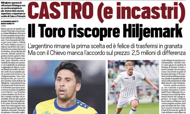 Tuttosport: “Castro (e incastri). Il Toro riscopre Hiljemark. E Goldaniga…”