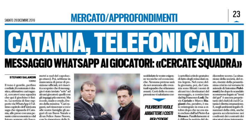 dialmente. Calcio Catania Spa”. Nel corso della giornata, poi, da Catania sono filtrati i nomi di alcuni tra i destinatari del messaggio, a cominciare dai big Francesco Lodi, Davis Curiale e Marco Biagianti. Parallelamente si è diffusa la notizia del decurtamento dello stipendio nei confronti di un altro gruppo di giocatori, quelli cioè che dovrebbero restare per finire la stagione: Mazzarani, Sarno, Esposito, Rizzo, Dall’Oglio, Silvestri, Calapai e Di Piazza gli indiziati. Difficile, però, che l’attuale società riesca a onorare le spettanze. La situazione della società, del resto, risente della pesantissima crisi in cui versano le aziende di Antonino Pulvirenti di cui il Catania è diretta emanazione. E nella città questa accelerazione nei confronti dei contratti dei giocatori viene interpretata come un altro dei tasselli per arrivare alla cessione del club. Alleggerire il più possibile il monte ingaggi e le altre spese per arrivare a un accordo entro le prossime ore. L’obiettivo è di definire il passaggio delle quote societarie al nuovo gruppo entro il 31 dicembre.