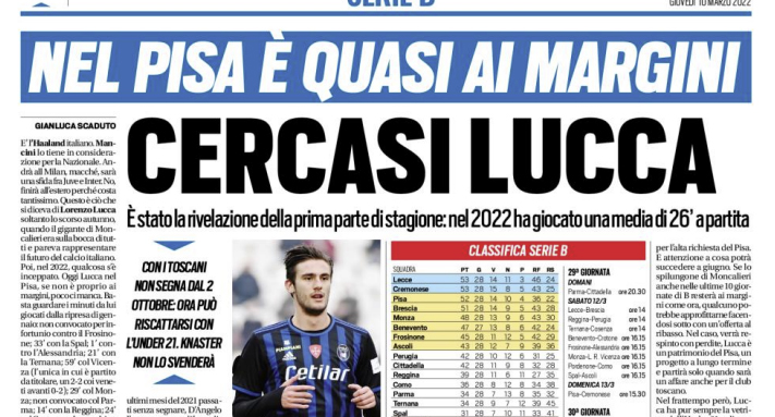 L’edizione odierna di Tuttosport si sofferma su Lorenzo Lucca, finito ai margini del Pisa.