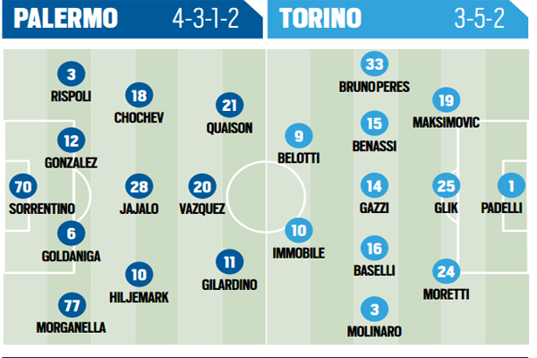 L’edizione odierna di “Tuttosport” ha stilato le probabili formazioni di Palermo-Torino. Con l’approdo di Giovanni Bosi sulla panchina, secondo il quotidiano, il Palermo scenderà in campo con un nuovo modulo. Ritorno al 4-3-1-2 dunque, con Jajalo che si riprende il posto in cabina di regia. In alto le potenziali scelte delle due squadre.