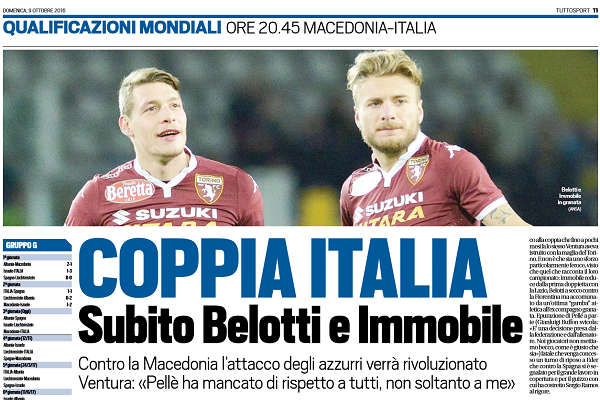 Tuttosport: “Coppia Italia, subito Belotti e Immobile. Contro la Macedonia l’attacco degli azzurri verrà rivoluzionato – le probabili formazioni” (FOTO)