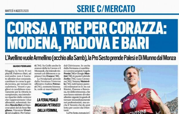L’edizione odierna di “Tuttosport” si sofferma sul calciomercato in Serie C. Simone Corazza, attaccante della Reggina che nell’ultimo periodo è stato accostato al Palermo, è contesto da Padova, Modena e Bari. In particolare, veneti e pugliesi vorrebbero assicurarsi il capocannoniere dell’ultimo girone C di Serie C per puntare alla promozione diretta in B.