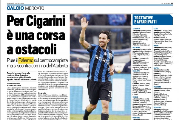 “Luca Cigarini piace parecchio. Prima la Fiorentina, quindi il Genoa, adesso ci prova anche il Palermo, il cui mercato è stato finora bloccato, tra voglia di vendere la società da parte di Maurizio Zamparini (o, almeno, di accogliere nuovi soci) e incassi mancati per la ritardata cessione di Franco Vazquez. Un desiderio, quello dei siciliani, che pare però destinato restare a livello di pia intenzione. Occorre infatti fare i conti con l’Atalanta e, soprattutto, con Gian Piero Gasperini. Il nuovo tecnico ha infatti posto il veto a un cessione del centrocampista, che ritiene l’uomo con l’esperienza giusta per dare equilibrio alla squadra nerazzurra che verrà. Palermo che allora ci concentra sulla cessione di Vazquez. Defilatosi il Milan, venuta meno la Premier League, rifiutata l’ipotesi Suning dallo stesso giocatore, ecco che si strigono i tempi con il Siviglia. Novità sono attese nel corso della settima- na, se non nelle prossime ore”. Questo quanto si legge sull’edizione odierna di “Tuttosport”.