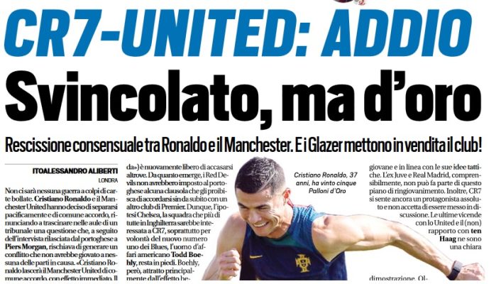 L’edizione odierna di Tuttosport si sofferma sul caso CR7 che ha detto addio allo United. Il quotidiano analizza quello che potrebbe essere il futuro del campione portoghese.