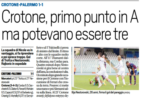 “Ha un sapore agrodolce il primo punto in Serie A della storia del Crotone. La squadra di Nicola va avanti, si fa riprendere e poi sciupa le migliori occasioni per conquistare i tre punti. Il Palermo, invece, raggiunto il pareggio sposta l’inerzia dalla sua parte, ma in quei pochi minuti non è in grado di colpire. De Zerbi propone il 4-3-3 con Nestorovski al centro dell’attacco, mentre Nicola sposta Rohden a destra e inserisce Capezzi, con Tonev che prova fino alla fine, ma non ce la fa. Il Crotone parte forte e al 5’ Falcinelli ci prova di sinistro dal limite. Il ritmo è alto con le squadre molto corte. All’11’ Diamanti dalla distanza, ma Cordaz para. Quattro minuti dopo Nestorovski si gira bene al centro dell’area, la conclusione è alta. Un minuto dopo grande occasione per il Crotone con l’incursione di Ferrari che crossa da terra. Posavec ci mette una mano e poi Aleesami salva sulla linea. Al 23’ Crotone avanti: delizioso esterno destro di Palladino per Falcinelli, Posavec e Raijkovic si scontrano, ma riescono a chiudere; da dietro arriva Trotta che deposita nella porta vuota. Nello scontro Rajkovic si procura la frattura scomposta del setto nasale (resta in osservazione all’ospedale). Nell’intervallo De Zerbi tira fuori Sallai e inserisce Embalo passando al 3-4-3. Al 16’ Palladino per Falcinelli anticipato, e Trotta di testa, ma questa volta Gonzalez salva in angolo. Al 21’ Aleesami va via sulla sinistra e mette in mezzo Nestorovski che di sinistro fa 1-1. Cordaz salva su Hiljemark. Nel finale doppia clamorosa occasione per il Crotone: al 40’ Stoian in mezzo per Falcinelli che solo davanti alla porta schiaccia male. Due minuti dopo lo stesso Stoian da ottima posizione calcia sull’esterno della rete”. Questo quanto scrive l’edizione odierna di “Tuttosport”.