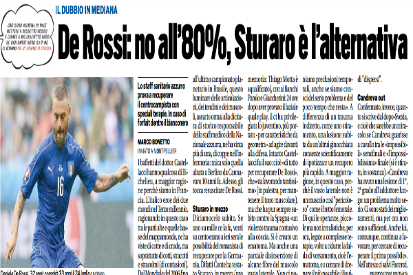 “I baffetti del dottor Castellacci hanno qualcosa di Richelieu, a maggior ragione perché siamo in Francia. L’italico eroe dei due mondi nel Terzo millennio, ragionando in questo caso tra le parti alte e quelle basse del mappamondo, ne ha viste di cotte e di crude, ma soprattutto di cotti, stracotti e stracolmi (di contusioni). Dal Mondiale del 2006 fino all’ultimo campionato planetario in Brasile, questo luminare delle articolazioni, dei tendini e dei muscoli, assurto ormai alla dicitura di storico responsabile dello staff medico della Nazionale azzurra, ne ha vinta più di una, di coppe nell’infermeria: mica solo quella alzata a Berlino da Cannavaro 10 anni fa. Adesso, gli tocca resuscitare De Rossi. Sturaro in mezzo Diciamocelo subito. Se uno su mille ce la fa, venti su cento erano a ieri sera le possibilità del romanista di recuperare per la Germania. Difatti Conte ha testato Sturaro, in mezzo (promemoria: Thiago Motta è squalificato), con ai fianchi Parolo e Giaccherini: 24 ore dopo aver provato il laziale quale play, il ct ha privilegiato lo juventino, più portato – per caratteristiche da geometra – ad agire davanti alla difesa. Intanto Castellacci fa il suo: cioè «di tutto per recuperare De Rossi», che «sta lavorando tantissimo» (in palestra, per mantenere il tono muscolare), ma che ha pur sempre subito contro la Spagna «un violento trauma contusivo alla coscia. Si è creato un ematoma. Ma anche una parziale disinserzione di alcune fibre del muscolo vasto laterale. Non ci poniamo preclusioni temporali, anche se siamo consci del serio problema e del poco tempo che resta». A differenza di un trauma indiretto, come uno stiramento, una lesione subita da un’altrui ginocchiata consente scientificamente di ipotizzare un recupero più rapido. A maggior ragione, in questo caso, perché il vasto laterale non è un muscolo così “pericoloso” come il retto femorale. Di qui le speranze, piccole ma non irrealistiche, per ora, legate a complesse terapie, volte a ridurre la falda di versamento, cioè l’ematoma, e a cercare di drenare il più possibile i liquidi “dispersi”. Candreva out Confermato, invece, quanto si scrive dal dopo-Svezia, e cioè che sarebbe un miracolo se Candreva guarisse a cavallo tra le «impossibili» semifinali e «l’impossibilissima» finale (si è stirato, in sostanza). «Candreva ha avuto una lesione di 1°, 2° grado all’adduttore lungo: un problema molto serio. Ci sono stati dei miglioramenti, ma per ora non sono sufficienti. Anche lui, comunque, continua a lavorare, per cercare di recuperare il prima possibile». Nell’attesa: ci salvi Florenzi“. Questo quanto riportato dall’edizione odierna di “Tuttosport”.