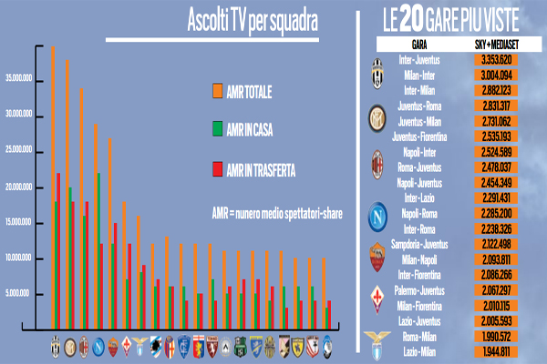 “Una buona norma per evitare di rischiare la faziosità o la palude del luogocomunismo, è senz’altro quella di non respingere i dati di un’analisi “solo” perché non piace ciò che i dati stessi raccontano. Il caso specifico è relativo alla ridistribuzione dei diritti tv: la vulgata sostiene che in Italia sia in iniqua mentre i numeri, questi impertinenti, dimostrano come si stia in un “range” piuttosto aderente alle realtà. E che anzi, udite udite, siano addirittura le grandi squadre ad avere lasciato qualcosa sul terreno rispetto alle medio-piccole. Una realtà sintetizzata dalla tabella qui a fianco: l’analisi comparativa del apporto tra spettatori (e dunque ricchezza prodotta) e ricavi incassati dai diritti penalizza Juventus e, ancor più, Napoli, Milan, Roma e Inter mentre avvantaggia, per esempio, il Torino, terzo come “guadagno” dopo l’Udinese e il “defunto” Parma. Dati che risulterebbero ancor più macroscopici se li rapportassimo all’ultima giornata del campionato attuale, con la Juventus che registrerebbe un -1,48 % rispetto alle risorse prodotte in termini di audience e il Torino un più 1,55 %. E’, quello della società di Cairo, il vantaggio maggiore mentre la perdita più grande andrebbe ascritta all’Inter che registra un – 3,06 per cento. Come dite? Che è possibile che a fine anno le cifre si allineino a quelle della scorsa stagione? Per nulla, perché purtroppo il trend degli spettatori di questa stagione è negativo sia dal punto di vista degli ascolti tv sia da quello delle presenze allo stadio. Intanto va sottolineato come le cosiddette “sette sorelle” (Juve, Inter, Milan, Napoli, Roma, Fiorentina e Lazio in ordine di audience) producano da sole ben il 61 % di tutti gli ascolti tv della Serie A. La seconda tabella in alto riassume partite più viste in tv (mancano ancora i dati relativi all’ultima giornata con Juventus-Napoli): tra le prime dieci vi sono solo gli incroci tra Juve, Inter, Milan, Napoli e Roma con due apparizioni di Fiorentina e Napoli contro, guarda un po’, la Juventus: i bianconeri sono protagonisti in sei delle prime dieci. Non va meglio per gli spettatori dal vivo: la percentuale di occupazioni stadi è del 57,5 per cento mentre in Premier League è al 95,7 %, in Bundesliga al 92,6 %, nella Liga spagnola al 68,3 e nella Ligue 1 francese al 66,68. Una Serie A, dunque, che viene perfino dopo la Francia, con il rischio che si deprezzi sempre di più anche a livello commerciale oltreché tecnico. Un dato ulteriore? Addirittura 41 gare sono sotto i 43 spettatori in tv, la media di tifosi “allo stadio” in Bundesliga. Così, se è sempre più evidente come sia controproducente trasmettere tutti gli eventi in tv e come sia sempre più urgente un lavoro sulle infrastrutture (Londra avrà tra breve 5 nuovi impianti con capienza superiore ai 50 mila posti), è altrettanto evidente come sia necessario lavorare sul “merito” per riequilibrare i diritti tv e per dare una scossa al campionato. La simulazione della distribuzione delle risorse (che pubblichiamo in alto) si discosta di pochissimo rispetto a quella della stagione precedenti. Ribadire che il sistema è cristallizzato senza le corrette letture dei dati è un esercizio di comodo e che fa comodo, perché l’analisi ribadisce che i “cavalli trainanti” del sistema sono quelle squadre che da sempre hanno investito e raccolto successi sportivi nel tempo. Per esempio: da una settimana, in Lega di A, si litiga sulla distribuzione dei 150 milioni in più del prossimo triennio. Sapete perché? Le medio piccole non vogliono che siano riassegnate sulla base del merito sportivo. Eppure sarebbe così semplice: più vinci, più guadagni. O no?”. Questo quanto si legge sull’edizione odierna di “Tuttosport”. Di seguito alcune illustrazioni: