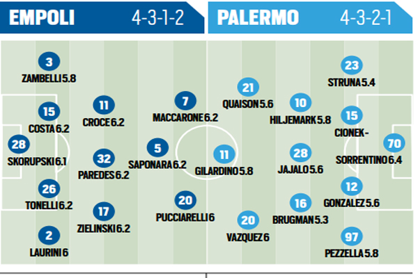 L’edizione odierna di “Tuttosport” ha stilato le probabili formazioni di Empoli-Palermo. Secondo il quotidiano torinese, poco cambierà nel modulo che il tecnico rosanero schiererà, con qualche dubbio di troppo: Novellino infatti, non ha ancora deciso se affidarsi a Gilardino in avanti oppure utilizzare Vazquez da «falso nove». A centrocampo ballottaggio tra Cristante e Brugman per sostituire lo squalificato Chochev, con l’uruguayano in pole.