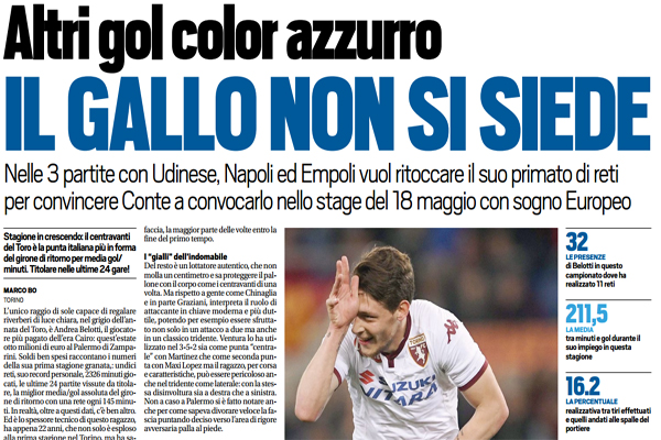 “L’unico raggio di sole capace di regalare riverberi di luce chiara, nel grigio dell’annata del Toro, è Andrea Belotti, il giocatore più pagato dell’era Cairo: quest’estate otto milioni di euro al Palermo di Zamparini“. Così l’edizione odierna di “TuttoSport” parla dell’annata del club granata e del suo bomber Andrea Belotti. “Soldi ben spesi raccontano i numeri della sua prima stagione granata: undici reti, suo record personale, 2326 minuti giocati, le ultime 24 partite vissute da titolare, la miglior media/gol assoluta del girone di ritorno con una rete ogni 145 minuti. In realtà, oltre a questi dati, c’è ben altro. Ed è lo spessore tecnico di questo ragazzo, ha appena 22 anni, che non solo è esploso alla prima stagione nel Torino, ma ha saputo aspettare con diligenza e intelligenza, forse non a caso i due termini fanno rima, per poi poter sfruttare al meglio le opportunità che ha cominciato ad offrigli Ventura: che oltre ad averlo fortemente voluto in estate, lo ha sempre celebrato come un predestinato per la Nazionale. E allora, soprattutto quando Quagliarella e Maxi Lopez hanno iniziato a deludere, il primo dal punto di vista prestazionale anche sotto porta, il secondo, idem, per una forma fisica sopra le righe, Belotti ha visto aumentare il proprio minutaggio. L’ex rosanero ha saputo aspettare e non deve essere stato facile attendere la 14ª giornata per far agitare la cresta del Gallo con il primo gol torinista, splendido, al Bologna. Ma come si sa, per crescere e fare carriera non basta il talento, occorre anche la testa, quella che aiuta a gestire al meglio i momenti più difficili. E così Belotti, ragazzo dal cuore grande e l’umiltà sempre in tasca, ha digerito rospi sino a quando, complice una condizione fisica sempre più tonica, si è affermato come punto di riferimento della squadra non solo sottoporta. Anche se con il passare del tempo Belotti ha iniziato a segnare a raffica, arrivando a quota 11, rivelandosi un cecchino anche dal dischetto, 4 centri su 4, sfruttando tre penalty procuratosi con la propria pericolosità: chiedere a Nagatomo, Manolas e Rossettini, mentre il quarto è arrivato grazie a Bruno Peres nel derby. Già, non è facile marcare Belotti, a chi gli tocca, spesso si vede sventolare il cartellino giallo in faccia, la maggior parte delle volte entro la fine del primo tempo. I “gialli” dell’indomabile Del resto è un lottatore autentico, che non molla un centimetro e sa proteggere il pallone con il corpo come i centravanti di una volta. Ma rispetto a gente come Chinaglia e in parte Graziani, interpreta il ruolo di attaccante in chiave moderna e più duttile, potendo per esempio essere sfruttato non solo in un attacco a due ma anche in un classico tridente. Ventura lo ha utilizzato nel 3-5-2 sia come punta “centrale” con Martinez che come seconda punta con Maxi Lopez ma il ragazzo, per corsa e caratteristiche, può essere pericoloso anche nel tridente come laterale: con la stessa disinvoltura sia a destra che a sinistra. Non a caso a Palermo si è fatto notare anche per come sapeva divorare veloce la fascia puntando deciso verso l’area di rigore avversaria palla al piede. Il valore aggiunto E proprio questa sua flessibilità d’utilizzo potrebbe rivelarsi quel valore aggiunto in grado di convincere il commissario tecnico Antonio Conte per il primo screening preEuropeo, che si terrà a Coverciano dal 18 maggio al 21 e al quale non parteciperanno i giocatori della Juventus e del Milan per l’impegno della finale di Coppa Italia. Cifre alla mano, al momento non c’è un attaccante italiano più in forma di Belotti che spera di vivere da protagonista queste ultime tre partite che restano: domani il Toro sarà di scena a Udine con calcio d’inizio alle 18, la domenica successiva al Grande Torino contro il Napoli e quindi finale ad Empoli. Se nel gruppo granata, causa stagione anonima per utilizzare un eufemismo, le motivazioni galleggiano sotto il livello di guardia, gli ultimi 10 minuti di Ventura sedutosi sconsolato in panchina sono un brutto segnale, per Belotti è tutta un’altra storia. In teoria sino a qualche settimana fa ce l’aveva in casa il primo “avversario” in chiave convocazione azzurra, Ciro Immobile, ma l’infortunio che sta costringendo l’ex Siviglia a restare ai box si è trasformato indirettamente in un vantaggio per chi come Belotti spera in una convocazione in extremis. La storia della Nazionale, tra l’altro, regala storie bellissime di attaccanti che non dovevano essere chiamati e poi, dopo la scommessa del ct di turno, diventarono la gallina dalle uova d’oro. Ok, lui è un Gallo, però…”.