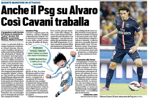 “Cavani è seguito pure da Chelsea, Atletico Madrid e Manchester United. Per la Juventus l’uruguaiano è una delle prime scelte in caso di addio di Morata. Con lo spagnolo al Psg, la corsa dei bianconeri a Cavani diverrebbe un po’ meno complicata. I campioni di Francia, che già devono sostituire il partente Zlatan Ibrahimovic, non vorrebbero privarsi del Matador. Sotto la Tour Eiffel sanno però benissimo che l’ex napoletano considera chiuso il ciclo in Ligue1. Cavani e Morata potrebbero anche giocare insieme – come dice Allegri, Alvaro è uno dei pochi attaccanti che può duettare con chiunque -, ma nel caso sarebbe più probabile un addio dell’uruguaiano. E Cavani, stando a quanto filtra dal sudamerica, ripartirebbe volentieri dalla Juventus. Con i dirigenti di corso Galileo Ferraris ci sono già stati diversi contatti e lo stesso è successo pure con Chelsea, Manchester United e Atletico Madrid. L’offerta più ricca, in realtà, finora è giunta dalla Cina: 105 milioni in 3 anni. Una proposta monstre che tenta Cavani, al momento però più propenso a continuare la sua carriera in Europa. Contratto alla Tevez L’uruguaiano a breve incontrerà il Psg con l’obiettivo di ottenere il via libera alla cessione. I francesi, in caso di fumata nera, proveranno a incassare almeno 40 milioni di euro. Una cifra alta, in linea con lo stipendio del giocatore (10 milioni netti; contratto fino al 2018). La Juventus, che da tempo sta misurando i costi dell’affare, proporrebbe proporre a Cavani un quadriennale con ingaggio “simil Tevez”: 5,5/6 milioni più ricchi bonus”. Questo quanto si legge sull’edizione odierna di “Tuttosport”.
