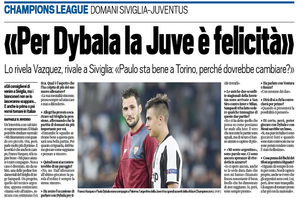 Tuttosport, ex rosa: “«Per Dybala la Juve è felicità». Lo rivela Vazquez, rivale a Siviglia: «Paulo sta bene a Torino, perché dovrebbe cambiare?»”