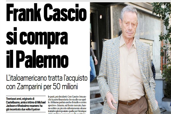 “«Ho avuto la fortuna di avere Michael Jackson come mentore. Mi ha insegnato che nulla è impossibile, mi ha insegnato a sognare in grande e fare grande attenzione a cosa si sogna… perché i sogni si realizzano». Così , al sito palermitano “Rotocalcio”, si è presentato Frank Cascio, l’imprenditore italo-americano che sta trattando l’acquisto del club da Maurizio Zamparini. La sua famiglia si è trasferita negli USA una quarantina di anni fa e lui, 36 anni, è nato oltre Atlantico. Ma, a parte la strettissima amicizia con Michael Jackson che risale ai tempi dell’infanzia, le sue passioni sono Castelbuono, il paese d’origine, e il tifo per il Palermo: «Che seguo da quando, a quattro anni, guardavo le partite seduto in braccio a nonno Ciccio». Lo descrivono come un personaggio di grande vitalità e dai multiformi interessi professionali. Il “core business” della sua attività è l’edilizia: quello che gli ha permesso, insieme con il socio Paul Baccaglini, di presentare una lettera d’intenti a Maurizio Zamparini per l’acquisto del club. Anche grazie al tramite molto attivo di Joe Tacopina, attuale presidente del Venezia., ci sono stati i primi contatti tra le parti e lo stesso Zamparini ha parlato di «interlocutori seri e affidabili» tanto che al primo incontro ne è seguito subito un’altro il giorno successivo. La trattativa sta andando avanti sulla base di un’offerta di 50 milioni e prevede che lo stesso Zamparini mantenga la carica di presidente onorario. La sensazione, insomma, è che la trattativa con Cascio sia indirizzata in maniera molto positiva, anche a scapito di quella con una fantomatica cordata cinese di cui, come d’abitudine in questi casi, non si conoscono referenti e termini: «mi sono sembrate delle persone giuste, all’altezza ha commentato Zamparini – Vediamo come procederà. I cinesi? Non c’è nessuna corsa a due con Cascio. Non c’è un primo o un secondo in questa trattativa. Sono due nomi ad essere in ballo ed entrambe le trattative sono molto serie. Io sento le parti, poi deciderò. Con Cascio c’era anche la parte finanziaria che sta alle sue spalle. Abbiamo parlato anche di stadio e centro sportivo». Intanto, sul fronte mercato, hanno subito un piccolo rallentamento alcune trattative già impostate: quella per Henrique del Corinthians così come quella per Marrone dalla Juve. Richieste per Gonzalez arrivano dall’Atalanta che per la difesa pensa anche a un ritorno di Benalouane dal Leicester”. Questo quanto riportato da “Tuttosport”.