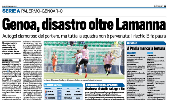 “L’orgoglio e la paura. Il primo ce l’ha il Palermo che sta chiudendo il suo campionato con dignità dopo essere già retrocesso: sette punti nelle ultime tre partite, niente regali per nessuno, nemmeno per il Genoa che al “Barbera” si giocava un pezzo di Serie A e che è stato costretto a tornarsene a casa a mani vuote. La seconda l’ha addosso il Genoa dopo questa sconfitta, inaspettata ma assolutamente meritata, perché i rossoblù non sono… scesi in campo. Servivano grinta, concentrazione e cattiveria, il Genoa – soprattutto nel primo tempo – non ha messo niente di tutto questo e s’è preso anche la contestazione di quel piccolo manipolo di tifosi arrivati fino a Palermo. Contestazione che non ha risparmiato anche i rosanero, con un «Barbera» quasi vuoto e uno striscione abbastanza eloquente contro i giocatori: «Hai passeggiato in campo come a Mondello, non sei né un calciatore né un fotomodello». E se al Palermo questi tre punti non servono a niente, per il Genoa questo stop significa tanto perché il Crotone ha battuto l’Udinese e adesso il distacco dai calabresi s’è assottigliato a soli due punti, con in mezzo l’Empoli (ko a Cagliari) a -1 dai rossoblù. A due giornate dalla fine, con Torino e Roma ancora da affrontare, per la banda di Juric c’è poco da scialare. Un Genoa autolesionista fino al punto di regalare al Palermo anche il gol che ha poi deciso la partita. Su un colpo di testa innocuo di Rispoli, Lamanna s’è trascinato la palla in porta in modo comico, autorete che è stata confermata dalla “goal line technology”. «Abbiamo preso un gol allucinante, poi sono mancate qualità e determinazione – commenta Juric, espulso nella ripresa per proteste – Questa partita è stata uno choc, dobbiamo dimenticarla in fretta e pensare a salvarci». Erano passati solo tredici minuti quando il Palermo è passato in vantaggio, c’era tutto per rimediare, ma il Genoa s’è fatto prendere da un torpore sorprendente per una squadra che vive con l’ossigeno. La sveglia non l’ha suonata nemmeno il cambio Cataldi-Palladino, un pizzico di reazione s’è vista solo dopo l’ingresso di Simeone nella ripresa. Niente di trascenentale però, perché il Palermo non ha mai rischiato la pelle e alla fine s’è preso una vittoria che aumenta i rimpianti. «Volevamo finire nel modo giusto – commenta Diego Bortoluzzi, che ha fatto esordire Ruggiero, un classe 2000 – sono soddisfatto del mio lavoro, mi candido anche per la prossima stagione». Ma Baccaglini, che in settimana dovrebbe diventare proprietario del Palermo, ha altre idee.”. Questo quanto riportato da “Tuttosport”.