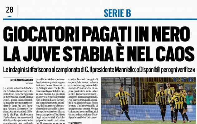 Tuttosport: “Giocatori pagati in nero, la Juve Stabia è nel caos”