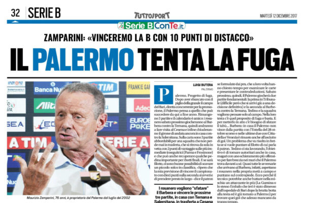 “Palermo. Progetto di fuga. Dopo aver sbancato con il piglio della grande il campo del Bari, diretta concorrente per la promozione, il Palermo pensa a quello che può succedere da qui a fine anno. Rimangono 3 partite e il calendario è amico: i rosanero sabato prossimo giocheranno al Barbera contro la Ternana, quindi andranno a fare visita al Cesena e infine chiuderanno il girone di andata ancora in casa contro la Salernitana. Sulla carta sono 3 partite abbordabili per una squadra che non perde mai in trasferta, che si ritrova da sola in vetta con 2 punti di vantaggio sulle più immediate inseguitrici (Parma e Frosinone) e che può anche recuperare qualche pedina importante per i botti finali. E se sarà filotto, ci sono buone possibilità di scavare un piccolo solco in classifica. Il progetto di fuga c’è, nessuno parla di tabelle, ma è chiaro che una sbirciata al calendario l’hanno data tutti. Chiudere l’andata con un buon margine di vantaggio su chi sta dietro darebbe forza per affrontare alla grande il girone di ritorno e per superare un’eventuale burrasca di natura giudiziaria. Sabato prossimo, proprio nell’imminenza della sfida alla Ternana, ci sarà la seconda udienza in Tribunale sull’istanza fallimentare chiesa dalla Procura. Giovedì scorso il Palermo ha presentato una corposa memoria difensiva con la quale intende smontare le accuse formulate dai pm, che a loro volta hanno chiesto tempo per esaminare le carte a presentare le controdeduzioni. Sabato quindi il Palermo giocherà due partite fondamentali”. Questo quanto scrive l’edizione odierna di “Tuttosport”.