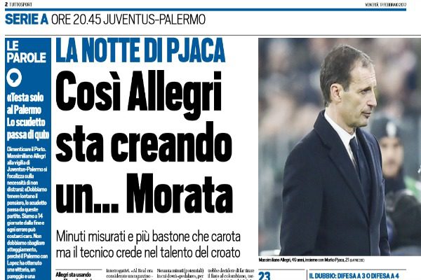 “Dopo mesi di complimenti caldi come il sole estivo, dal «Sarà il grande acquisto di gennaio» al «predestinato» di poche settimane fa, ieri le parole di Massimiliano Allegri su Marko Pjaca sono sembrate una di quelle secchiate d’acqua fredda che ti centrano mentre ti abbronzi su un lettino: «Deve cominciare a capire che per raggiungere certi livelli bisogna che incominci a pedalare, perché il calcio non è fatto solo di tecnica ma anche di sacrifici e disponibilità». Una bella sferzata, ma che non è affato segno di un cambiamento del giudizio di Allegri sul croato. Anzi, è una fase del processo di trasformazione da promessa a campione a cui il tecnico aveva già sottoposto Alvaro Morata. Non sorprenda, quindi, il bastone usato ieri dal tecnico dopo tante carote verbali regalate al suo puledro di razza. Pjaca deve salire quello stesso gradino che separa le promesse dai campioni e questo è il momento giusto per farlo, con la Champions che entra nella fase a eliminazione diretta, il campionato che offre chance di fuga e la Coppa Italia che adesso inizia a luccicare: «Ora se si entra si deve determinare. Marko ha grandi qualità, ma siamo alla Juve e se vuoi diventare un grande giocatore devi avere la giusta mentalità». Quasi certamente stasera il croato potrà dimostrare di possederla fin dal primo minuto, complice la squalifica di Mandzukic, in quella che sarebbe la sua seconda partita stagionale da titolare. Novanta minuti (potenziali) in cui dovrà «pedalare», per usare il termine utilizzato da Allegri, avanti e indietro sulla fascia, oltre a mettere in mostra dribbling e accelerazioni. E magari mostare anche un po’ di precisione e cattiveria in più nel chiudere l’azione, per segnare il suo primo gol in bianconero. staffetta croata Con Pjaca, a cercare di far breccia nella difesa del Palermo, ci saranno sicuramente Gonzalo Higuain e Paulo Dybala, mentre è in dubbio la presenza dal primo minuto di Cuadrado. Allegri potrebbe decidere di far tirare il fiato al colombiano, tornando al 4-3-3 o al 4-3-2-1 e inserendo Sturaro a centrocampo, accanto a Marchisio e a uno fra Khedira e Pjanic. Una soluzione a cui, se non dovesse sceglierla dall’inizio, l’allenatore bianconero farebbe probabilmente ricorso durante la partita, come lui stesso ha anticipato nel corso della conferenza stampa della vigilia. Qualunque sia l’assetto, Pjaca occuperà il settore di sinistra lasciato libero da Mandzukic, in una staffetta croata che offrirà al ventunenne talento il modello perfetto da imitare. Non a livello tecnico, visto che i due hanno caratteristiche profondamente diverse, ma sul piano della mentalità: sui tre termini usati da Allegri, «pedalare», «sacrificio» e «disponibilità», Mandzukic potrebbe scrivere un trattato.”. Questo quanto riportato da “Tuttosport”.