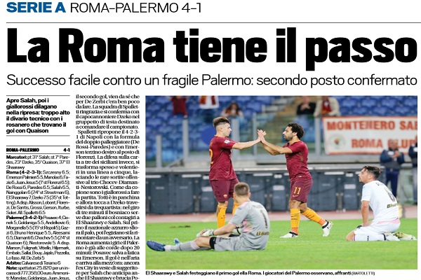 Tuttosport: “La Roma tiene il passo. Successo facile contro il fragile Palermo: secondo posto confermato”