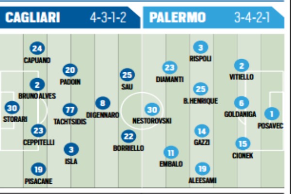 Cagliari-Palermo sarà la sfida che lunedì sera alle 21 chiuderà l’11^ giornata di serie A. De Zerbi sembra intenzionato a tornare alla difesa a 3 formata da Vitiello, Goldaniga e Cionek. A centrocampo Rispoli, Henrique, Gazzi e Aleesami, mentre in avanti l’unica punta Nestorovski supportata da Diamanti e Embalo. Ecco in basso la foto delle probabili formazioni dell’edizione odierna di “Tuttosport”: