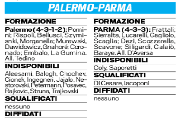 L’edizione odierna di Tuttosport ha stilato le probabili formazioni di Palermo-Parma, in programma domani alle 15. Ecco in alto le potenziali scelte dei due tecnici.