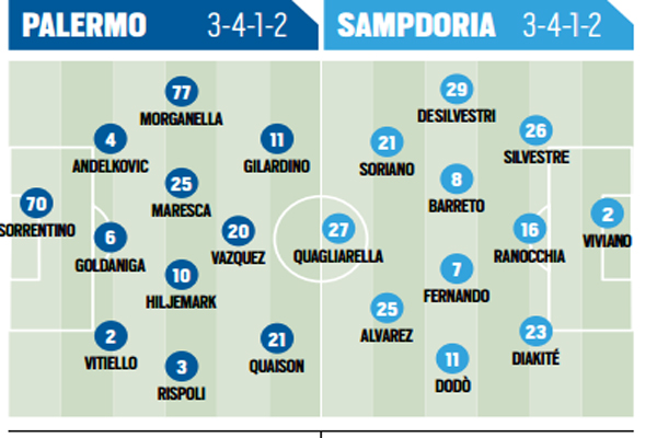 L’edizione odierna di “Tuttosport” ha stilato le probabili formazioni del match in programma domani tra Palermo e Sampdoria. Ecco quanto scrive il quotidiano in merito alla sfida: “PALERMO. Possibile conferma per la difesa 3, ma con interpreti diversi rispetto a quelli che hanno giocato a Frosinone. Goldaniga prenderà il posto dello squalifi cato Gonzalez, Vitiello quello di Cionek. SAMPDORIA: Moisander ancora a parte (out solo Ivan e Carbonero). Ballottaggio Alvarez-Correa-CassanoMuriel con Quagliarella prima punta”. In alto le potenziali scelte dei due tecnici.