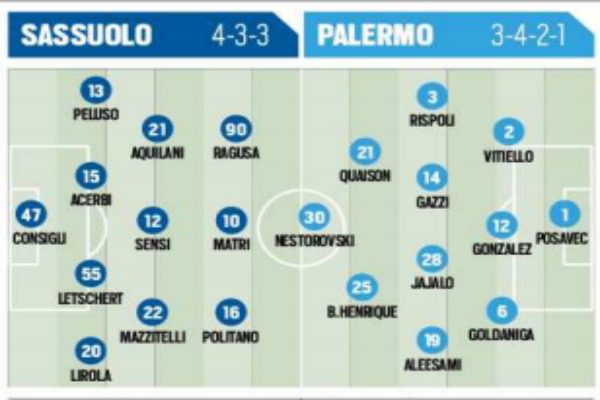 Questo pomeriggio alle 15 andrà in scena il match tra Sassuolo e Palermo, sfida valida per la 20^ giornata del campionato di serie A. Ecco le probabili formazioni di “Tuttosport”: