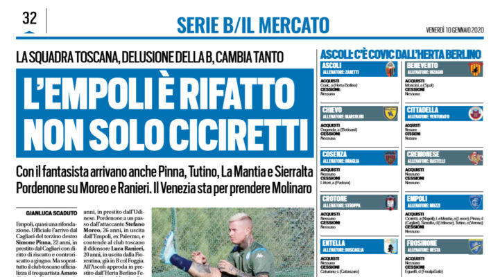 Tante le operazioni di calciomercato che si stanno definendo in Serie B, con l’Empoli che stando a vita a una vera e propria rivoluzione. L’edizione odierna di “Tuttosport” fa il punto sul calciomercato del campionato cadetto. Empoli, quasi una rifondazione. Ufficiale l’arrivo dal Cagliari del terzino destro Simone Pinna, 22 anni, in prestito dal Cagliari con diritto di riscatto e controriscatto a giugno. Ma soprattutto il club toscano ufficializza il trequartista Amato Ciciretti, 26 anni, mai utilizzato dal Napoli, nella seconda parte della scorsa stagione all’Ascoli (15 partite, 2 reti), in prestito con opzione di riscatto a fine stagione. Prossimi colpi l’attaccante Andrea La Mantia, 28 anni, che arriva a titolo definitivo dal Lecce (3,2 milioni più un bonus di 1 milione in caso di promozione nei prossimi 18 mesi), la punta Gennaro Tutino, 23 anni, ai margini nel Verona ma che nella scorsa stagione segnò i gol salvezza del Cosenza, il difensore cileno (con passaporto spagnolo) Francisco Sierralta, 22 anni, in prestito dall’Udinese. Pordenone a un passo dall’attaccante Stefano Moreo, 26 anni, in uscita dall’Empoli, ex Palermo, e contende al club toscano il difensore Luca Ranieri, 20 anni, in uscita dalla Fiorentina, già in B col Foggia. All’Ascoli approda in prestito dall’Herta Berlino l’esterno 21enne Maurice Covic, tedesco di origini croate, dalla squadra B dei berlinesi. Il Perugia ha chiuso per il difensore Slobodan Rajkovic, 30 anni, svincolato ex Palermo(Trattativa saltata negli ultimi minuti. Clicca qui), prossimo colpo il mediano Matteo Scozzarella, 31 anni, in uscita dal Parma. Venezia, si allena con la squadra il difensore Cristian Molinaro, 36 anni, svincolato ex Frosinone, che presto dovrebbe essere tesserato. Due in prova anche al Perugia: il difensore statunitense 21enne Giuseppe Barone, figlio di Joe, braccio destro di Commisso alla Fiorentina, ex Cosmos, con lui Jonathan Liljedahl, attaccante svedese 18enne, proveniente dall’Orgryte, B svedese: il primo ha poche chance di essere tesserato, il secondo dovrebbe giostrare fra Primavera e prima squadra. La Salernitana bussa allo Spezia per il centrocampista Luca Mora, 31 anni e sta per chiudere col Brescia per il terzino sinistro italo-brasiliano Falipe Curcio, 26 anni, pronto un contratto fino al 2022. Livorno vicino al centrocampista camerunense Joseph Minala, ex Salernitana, ai margini nella Lazio e chiede all’Ascoli il terzino sinistro Salvatore D’Elia e il centrocampista Alberto Gerbo (sul quale c’è anche il Crotone), entrambi 30enni. Cosenza e Trapani si contendono il centrocampista Giuseppe Rizzo, 28 anni, in uscita dal Catania. Il club calabrese insegue (assieme al Pescara), la punta spagnola Raul Asencio, 21 anni, proprietà Genoa, in uscita dal Pisa. Vladan Dekic, portiere serbo 20enne, è vicino al Pisa, in prestito dall’Inter. Il club toscano ha ormai chiuso anche per l’attaccante Luca Vido, 22 anni, proprietà Atalanta, in forza al Crotone. Chievo, se ne va al Leeds (B inglese) il portiere 18enne Elia Caprile, 4 anni e mezzo di contratto.