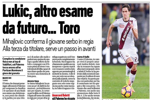 Tuttosport: “Lukic, altro esame da futuro…Toro. Contro il Palermo Mihajlovic conferma il giovane serbo in regia”