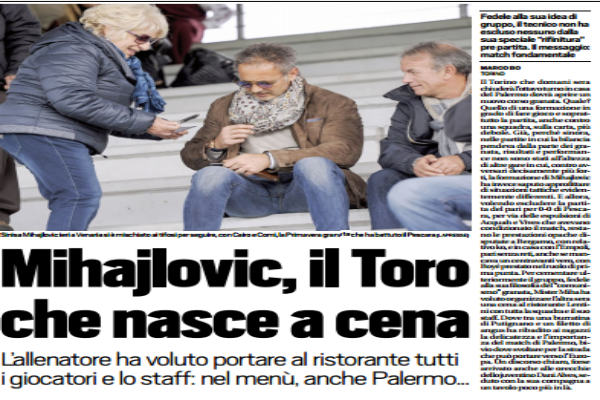 Tuttosport: “Mihajlovic, il Toro che nasce a cena. L’allenatore ha voluto portare al ristorante tutti i giocatori e lo staff: nel menù, anche Palermo…”