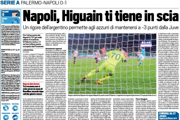Tuttosport: “Napoli, Higuain ti tiene sulla scia della Juve. Il Palermo resta a +1”