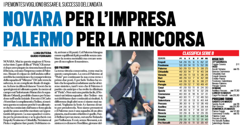 “NOVARA. Mai in questa stagione il Novara ha vinto 2 gare di fila al “Piola”. Gli azzurri dopo aver piegato in rimonta lunedì sera il Brescia, cercano l’impresa contro il Palermo. Bissare il colpaccio dell’andata rafforzerebbe la convinzione e la consapevolezza della squadra di “Mimmo” Di Carlo verso la salvezza, in un complicato finale di stagione. In forse in difesa il danese Troest che in questi giorni si è allenato a parte. In mezzo al campo out l’infortunato Maracchi e lo squalificato Orlandi, possibile chance per Sciaudone nell’undici iniziale. Il tecnico Di Carlo: «Vorrei fare i complimenti a Tedino, si meritava questa occasione perché è un allenatore che ha cominciato dal basso e forse già da qualche anno avrebbe meritato un’opportunità del genere. La sua squadra è costruita per la promozione e se la giocherà con Empoli, Frosinone e Cittadella. Noi siamo al Piola e vogliamo fare punti. Dobbiamo essere come il falco quando avvista la preda, che attacca al momento giusto senza esitare. Nella prima parte della settimana abbiamo lavorato sul recupero mentale dopo la partita col Brescia. Abbiamo insistito sulla difesa a quattro con due varianti: il 4-4-2 e il 4-3-3. Il nostro obiettivo è dare continuità, arrivare a 50 punti. Col Palermo bisogna essere equilibrati il più possibile senza cambiare la nostra mentalità ma cercare sempre di raccogliere il massimo»”.
