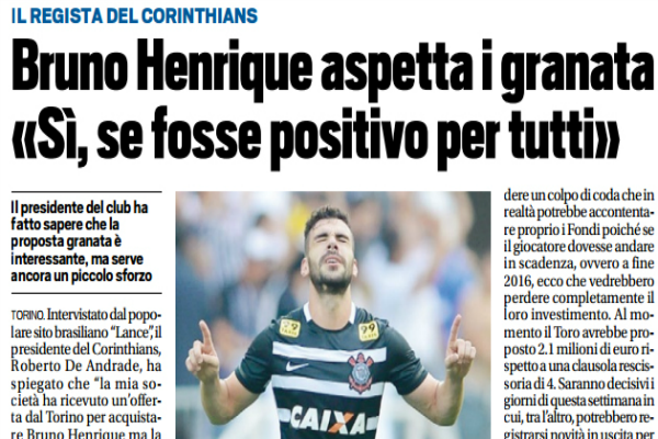 “Intervistato dal popolare sito brasiliano “Lance”, il presidente del Corinthians, Roberto De Andrade, ha spiegato che “la mia società ha ricevuto un’offerta dal Torino per acquistare Bruno Henrique ma la proposta al momento non è ancora considerata soddisfacente sia nella forma di pagamento che nella cifra finale. Però stiamo ancora trattando». Dunque non si può considerare completamente chiusa la strada che potrebbe portare il centrocampista al Torino nonostante la società granata abbia ingaggiato, dopo Lukic, anche Tachtsidis per una somma complessiva di tre  milioni di euro. Ma come ha detto l’altro giorno Mihajlovic, nel ruolo di regista dovrebbe arrivare ancora un tassello per cui… E Bruno Henrique ieri è intervenuto su “O Globo” parlando per la prima volta sulla sua delicata situazione che lo vede protagonista di una querelle che non vede interessato soltanto il club brasiliano, proprietario al 25% del suo cartellino, ma anche i Fondi che ne detengono il restante 75%. “Io al Torino? Sì se dovesse risultare positivo per me e il Corinthians” ha detto Bruno Henrique. Non si può escludere un colpo di coda che in realtà potrebbe accontentare proprio i Fondi poiché se il giocatore dovesse andare in scadenza, ovvero a fine 2016, ecco che vedrebbero perdere completamente il loro investimento. Al momento il Toro avrebbe proposto 2.1 milioni di euro rispetto a una clausola rescissoria di 4. Saranno decisivi i giorni di questa settimana in cui, tra l’altro, potrebbero registrarsi novità in uscita per Vives che nel ruolo di regista non rientra nei canoni che predilige Mihajlovic. Sembra invece molto più difficile che si possa riallacciare il discorso con il Napoli per Valdifiori dopo il lungo tiramolla tra i due club, a deteriorare rapporti già tesi per la grana legata al difensore Maksimovic, più volte richiesto dai partenopei”. Questo quanto si legge sull’edizione odierna di “Tuttosport”.
