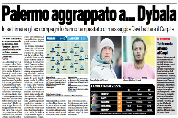 Tuttosport: “Palermo aggrappato a…Dybala. In settimana gli ex compagni lo hanno tempestato di messaggi: «Devi battere il Carpi!» – le probabili formazioni”