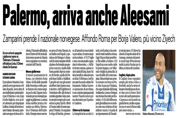 “Il presidente Maurizio Zamparini lo aveva promesso ed è stato di parola. Aveva detto di aver individuato i primi rinforzi per il Palermo e così, dopo il serbo Rajkovic, ecco un altro elemento per rimpolpare la difesa. Si tratta del terzino sinisto Haitam Aleesami, nazionale norvegese in forza al Goteborg. Il Sassuolo ufficializza invece l’arrivo di Pol Lirola dalla Juventus mentre in Olanda viene segnalato su Letschert, centrale dell’Utrecht. Mosse giallorosse Si muove pesantamente la Roma, con obiettivo Borja Valero. Al di là delle smentite della Fiorentina e delle parole d’amore del centrocampista per la città, l’agente sta lavorando per un eventuale passaggio in giallorosso. La stessa Roma sarebbe pronta a formulare un offerta, l’alternativa è Tielemans dell’Anderlecht. Al tempo stesso non viene perso di vista Diawara, in un duello con il Napoli. La posizione del Bologna è chiara: cede il centrocampista ribelle al primo che formula una proposta concreta. Quella dalla Roma partirà dopo la cessione di Paredes, quella del Napoli dopo l’addio a Valdifiori. E proprio ieri sera gli azzurri avrebbero fatto il passo avanti decisivo. Dall’Inghilterra il Tottenham offre alla Roma il centrale argentino Fazio, mentre prende sempre più consistenza la pista Ziyech: offerti al Twente soldi e il centrocampista H’Maidat. Da segnalare lo sfogo di Machin, promesso al Sassuolo in una trattativa poi saltata. Il centrocampista ha twittato: «E’ il 27 luglio e sono con mia madre a guardare le telenovelas…». Sull’altro fronte romano, paiono vicini i saluti di Keita, dopo l’ultima baruffa in allenamento: su di lui c’è il Monaco. Ieri l’attaccante ha anche saltato l’allenamento. Wallace ha invece annunciato di aver firmato un contratto quinquennale mentre Thauvin resta la prima alternativa per il partente Candreva. Chievo su De Guzman La Sampdoria ha accolto Linetty, ieri il polacco ha sostenuto le visite mediche a Roma. Oggi i blucerchiati potrebbero dire addio a Soriano: c’è il Napoli ma sono molto calde le ipotesi Spagna, con Villarreal e Siviglia in prima fila. In caso di addio del centrocampista, i blucerchiati sono pronti a tornare con forza su Praet. Idea Acuna per l’Atalanta, che segue il laterale dal Racing Avellaneda. Genoa e Bologna non trovano l’accordo per Rossettini: c’è il sì del difensore, però gli emiliani non scendono sotto una richiesta di due milioni e mezzo. E si parla di un ripensamento di Donadoni sul giocatore. Il Chievo ha chiesto al Napoli notizie di De Guzman, rientrato dal prestito con il Carpi. Il Pescara non molla la pista Pazdan per la difesa, in attesa di Gyomber. Cagliari, dopia pista Il Cagliari viene segnalato sempre più vicino a Isla e a Borriello, anche lo stesso allenatore Rastelli pensa di avere i due con sé a breve. Ma il tecnico dei sardi ammonisce: «Capozucca sta facendo un grande lavoro, ma fino a quando non ci sono le firme nulla può essere sicuro…»”. Questo quanto si legge su “Tuttosport”.