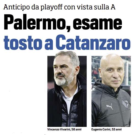 Nel derby del Sud contro il Palermo, il Catanzaro dovrà dimostrare di valere un posto nei playoff , dopo essere stato travolto e ridimensionato dalla Feralpisalò, meno di una settimana fa. «Per me è l’avversario migliore da affrontare, perché potremo provare di aver compreso la lezione degli ultimi, recenti passi falsi. Ma pure di aver capito come rimediare a tutti i problemi che sono emersi», ha spiegato Vincenzo Vivarini, evidentemente colpito dal brusco stop subito in casa del fanalino di coda del campionato. Al Ceravolo arriva un Palermo in salute, scortato da almeno 700 sostenitori rosanero; ma non mancheranno almeno 9.500 tifosi giallorossi.