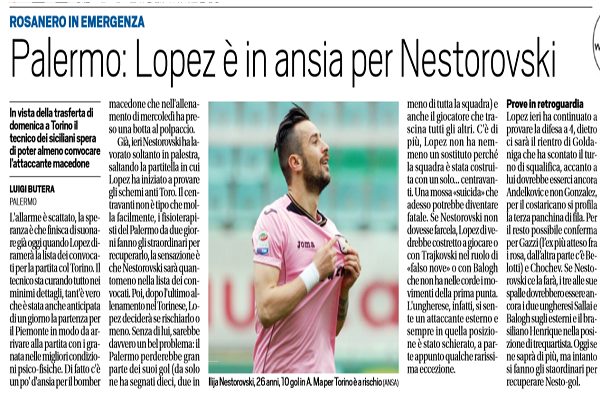 “L’allarme è scattato, la speranza è che finisca di suonare già oggi quando Lopez diramerà la lista dei convocati per la partita col Torino. Il tecnico sta curando tutto nei minimi dettagli, tant’è vero che è stata anche anticipata di un giorno la partenza per il Piemonte in modo da arrivare alla partita con i granata nelle migliori condizioni psico-fisiche. Di fatto c’è un po’ d’ansia per il bomber macedone che nell’allenamento di mercoledì ha preso una botta al polpaccio. Già, ieri Nestorovski ha lavorato soltanto in palestra, saltando la partitella in cui Lopez ha iniziato a provare gli schemi anti Toro. Il centravanti non è tipo che molla facilmente, i fisioterapisti del Palermo da due giorni fanno gli straordinari per recuperarlo, la sensazione è che Nestorovski sarà quantomeno nella lista dei convocati. Poi, dopo l’ultimo allenamento nel Torinese, Lopez deciderà se rischiarlo o meno. Senza di lui, sarebbe davvero un bel problema: il Palermo perderebbe gran parte dei suoi gol (da solo ne ha segnati dieci, due in meno di tutta la squadra) e anche il giocatore che trascina tutti gli altri. C’è di più, Lopez non ha nemmeno un sostituto perché la squadra è stata costruita con un solo… centravanti. Una mossa «suicida» che adesso potrebbe diventare fatale. Se Nestorovski non dovesse farcela, Lopez di vedrebbe costretto a giocare o con Trajkovski nel ruolo di «falso nove» o con Balogh che non ha nelle corde i movimenti della prima punta. L’ungherese, infatti, si sente un attaccante esterno e sempre in quella posizione è stato schierato, a parte appunto qualche rarissima eccezione. […]”. Questo quanto riportato da “Tuttosport”.