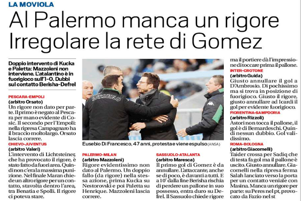 L’edizione odierna di “Tuttosport” pone diverse gare di serie A giocate ieri alla moviola. Su Palermo-Milan, si legge: “Rigore evidentissimo non dato al Palermo. Un doppio fallo (da rigore) nella stessa azione, prima Kucka su Nestorovski e poi Paletta su Henrique. Mazzoleni lascia correre”.