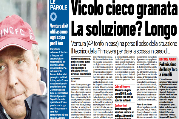 “Aveva chiesto pazienza, perché con i giovani non si ottiene tutto e subito. Ma il suo Toro è allo sbaraglio e sembra privo di guida tecnica, confuso e autolesionista. Sì, allo sbando, veterani e ultimi arrivati. In campo durano nemmeno venti minuti, il tempo di andare in vantaggio e di fermarsi. Perché? La quarta sconfitta in casa è pesante, e alla fine il pubblico esplode con cori inequivocabili: «Ventura, Ventura vaff…». Ingrati? Beh, sui termini si può sempre discutere. Nella sostanza, l’allenatore granata entra nel mirino, quasi come avesse esaurito il credito. Perché la gente non vede sbocchi. Il gioco è peggiorato, la squadra è nervosa, oltreché autolesionista. Problema fisico? A precisa domanda, Marco Benassi ha risposto così: «Assolutamente no, altrimenti a Genova non avremmo corso fino allo scadere». Questione di personalità, di mentalità, di involuzione, di qualità bassa, di sistema di gioco se non superato perlomeno inadeguato in questo momento: non aiuta a ottenere risultati, se gli interpreti non sono tutti all’altezza e non si spinge con continuità, salvo poi subire e magari fare tutto da soli, come ieri. Logica la contestazione al fischio di Rocchi. «Questa è stata una partita che non è nel dna del Toro – altre parole di Giampiero Ventura -: sono molto dispiaciuto, per il pubblico che fino all’ultimo è stato disponibile al contrario di altre volte quando invece c’era tensione. Inutile, poi, analizzare adesso le contestazioni: chi è venuto allo stadio è stato vicino alla squadra; una parte del pubblico è sempre stata al contrario un po’ così, non c’è nulla di nuovo». Opzione interna Di nuovo c’è che si comincia a pensare a un prossimo futuro, più o meno immediato, senza lo stesso Ventura. Chiariamo: il presidente Urbano Cairo ha firmato il rinnovo sino al 2018 con l’allenatore genovese, uomo perno del progetto che va avanti dal 2011 e che prevede una crescita costante, con innesti mirati. E adesso chiede di far quadrato, che la bufera passerà. Intanto, però, comincia a filtrare il nome di Moreno Longo come possibile soluzione se le cose dovessero precipitare. Nessuno se lo augura, ovvio. Però nel calcio che conta nessuno si fa trovare impreparato. Detto questo, non si vuole esonerare Ventura, ma si prova a vedere chi potrebbe “dare una mano nel caso che…”. Il tecnico campione d’Italia con i “granatini” piace ai tifosi, chiaro. E piace ai dirigenti, non solo del suo club, visto che le offerte e le sirene dall’esterno non mancano. Con il baby Toro ha vinto il campionato, la Supercoppa; soprattutto ha mostrato di possedere un bagaglio tecnico notevole. Non è legato a un modulo, cambia a seconda degli interpreti, ha portato la gente a ri-innamorarsi anche dell’altro Toro, appunto. Quello che trascina diecimila persone all’Olimpico e regala spettacolo e passione viscerale sino alla fine, contro avversari italiani e internazionali, come successo in Youth League. Sarebbe un ponte verso il futuro, verso annate prossime dove in rosa dovranno esserci i giocatori formati in casa. Con il Fila che sta tornando… Punto di non ritorno Adesso, la palla massa nelle mani, o nei piedi, di Ventura. O recupera la squadra e mette insieme risultati – ridando un obiettivo che possa stimolare la truppa, perché al momento si vivacchia, con la complicità di una classifica che in fondo è comunque segnata da tempo: ma occhio, il Verona ultimo è più vivo di Glik e compagni – oppure il vicolo cieco granata sarà il suo traguardo conclusivo. «Se sono preoccupato? Certo, perché tengo al Toro». Allora lo ripresenti. E non nella brutta copia vista col Chievo”. Questo è quanto scrive l’edizione odierna di “Tuttosport”.